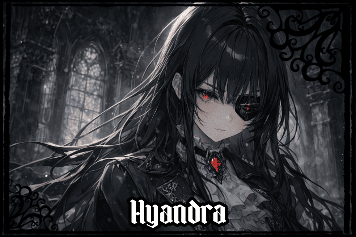 Um braço surgiu primeiro — elegante, envolto por uma luva preta. Ele se apoiou no corrimão, revelando pouco a pouco a figura de sua dona. Um olho vermelho intenso os observava de cima. O outro, coberto por um tapa-olho negro e uma franja densa, escondia parte de seu rosto.