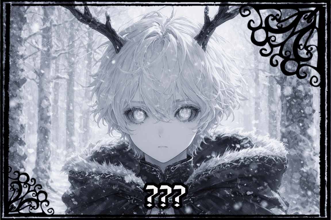 No meio desse ambiente calmo e aparentemente inóspito, havia um ser pálido, envolto em um manto negro, encostado a uma árvore — talvez dormindo. Seu corpo imóvel se destacava na paisagem silenciosa. Tinha a aparência jovem, próxima a de um adolescente, com cabelos brancos, médios, e grandes chifres de cervo saindo do topo de sua cabeça.