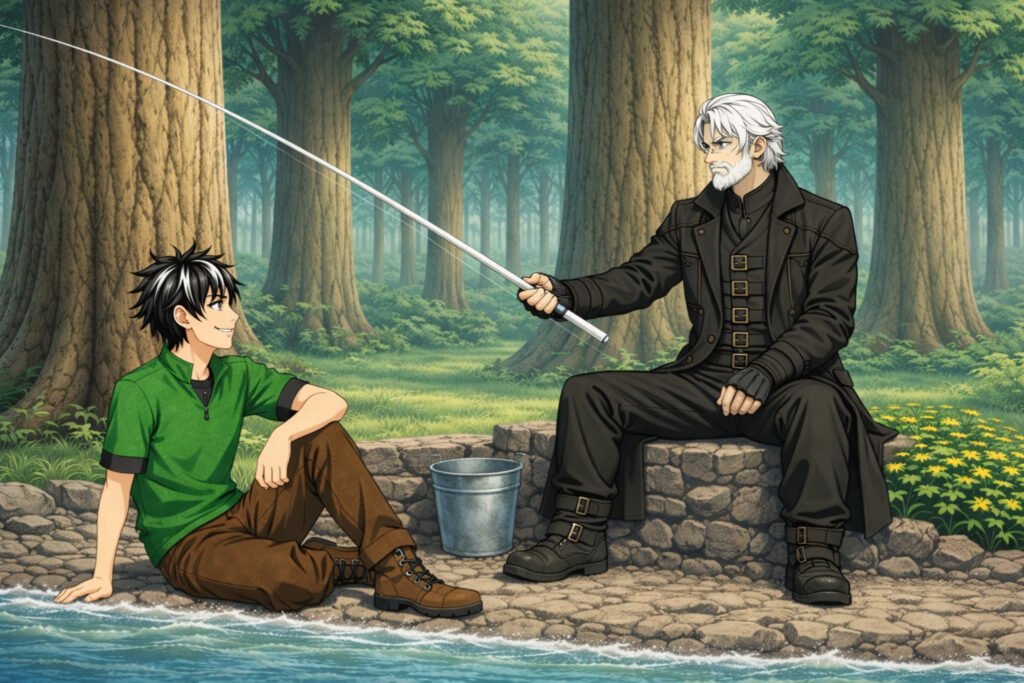 Um balde cheio de peixes ao lado. Uma vara translúcida firme nas mãos. Postura relaxada. Quieto demais para ser só um pescador comum.
