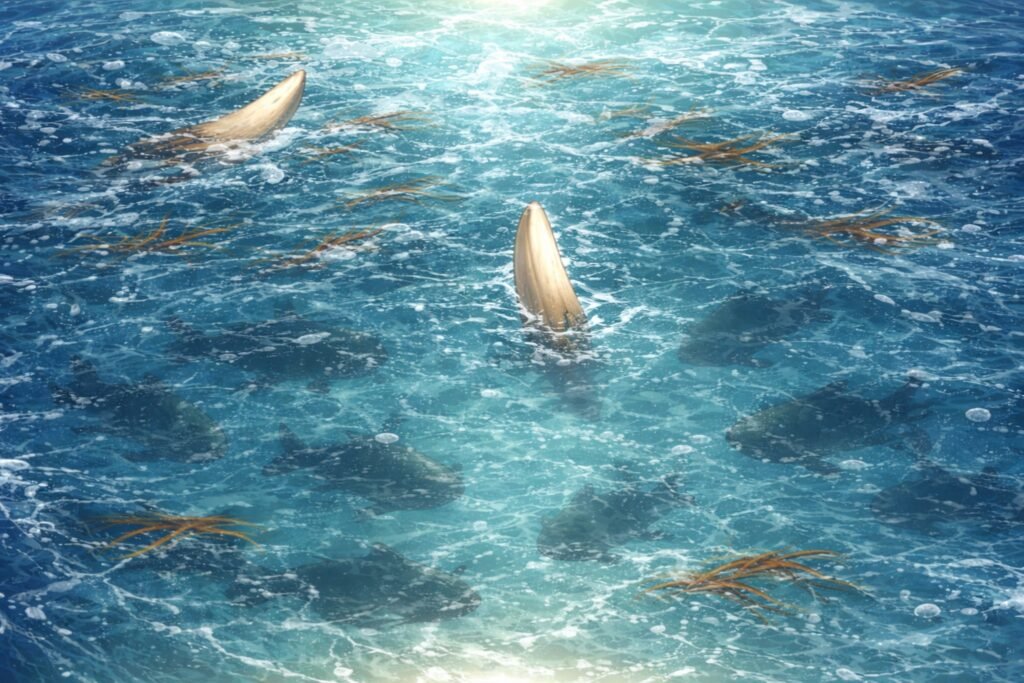 Por um momento, duas presas curvadas, grandes demais para qualquer peixe comum, boiam e giram devagar… até afundarem de novo.