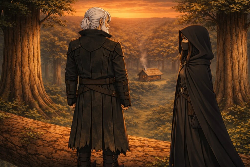 O salto é absurdo, muito acima de qualquer pessoa comum. Ele pousa em um galho alto, onde uma jovem o espera, braços cruzados.