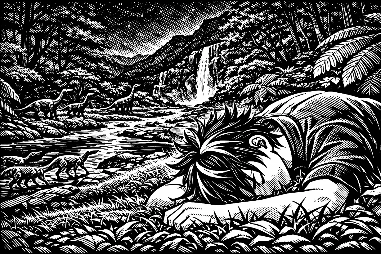 Ele serpenteia entre plantas gigantes, raízes grossas e folhas largas que brilham sob a luz dos astros. Dinossauros bebem em suas margens, e o chão treme a cada passo pesado que dão.