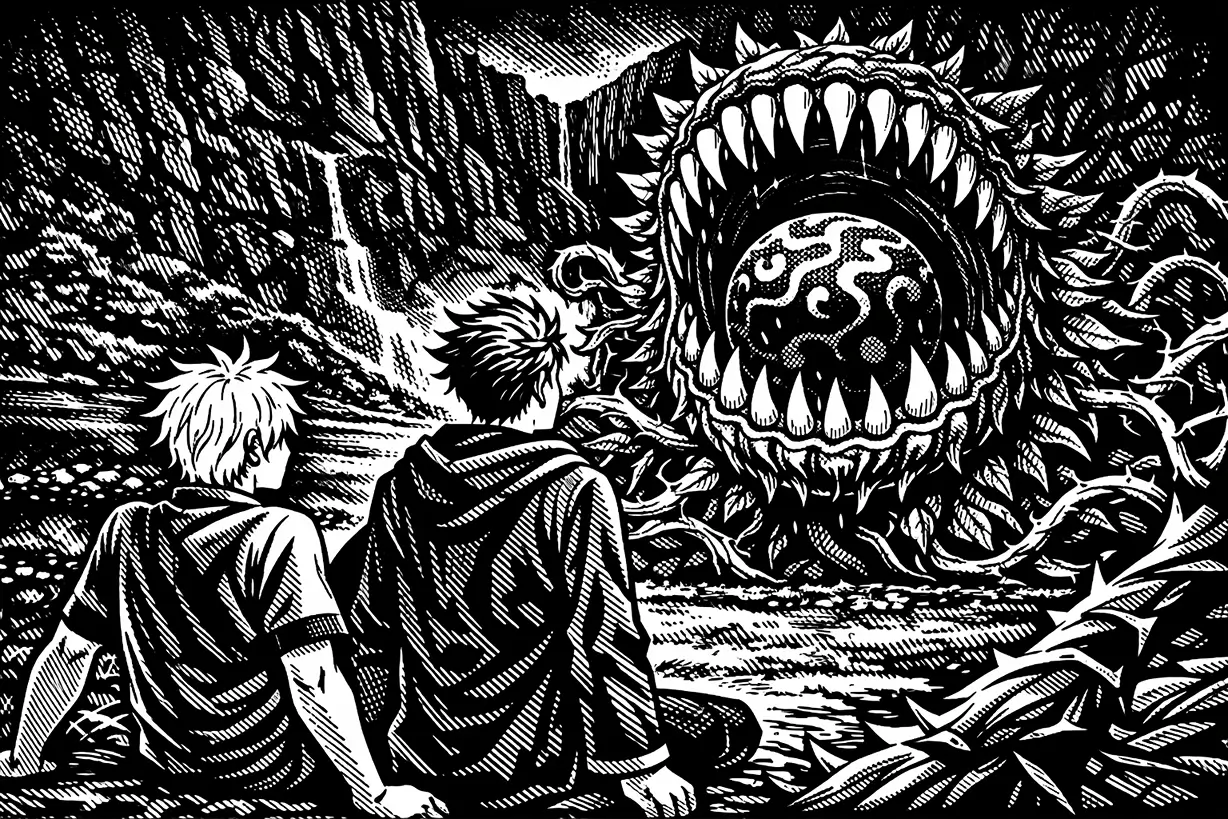 Então o solo se rompe. Do chão irrompe uma planta colossal, toda dentes e cipós. O Mago ergue o dedo, como quem finalmente encaixa a peça que faltava.