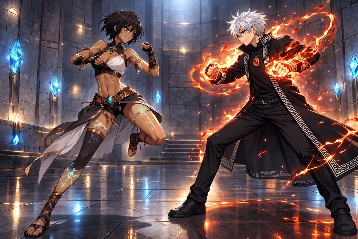 Tonto, encara a lutadora. Os ombros e quadris dela se movem e, um instante depois, um rastro translúcido do corpo repete o gesto, meio atrasado, uma investida fantasma onde a imagem demorasse a voltar. Chamas discretas se acendem ao redor dos punhos do garoto. Ambos adversários ajustam a base para voltar ao combate.