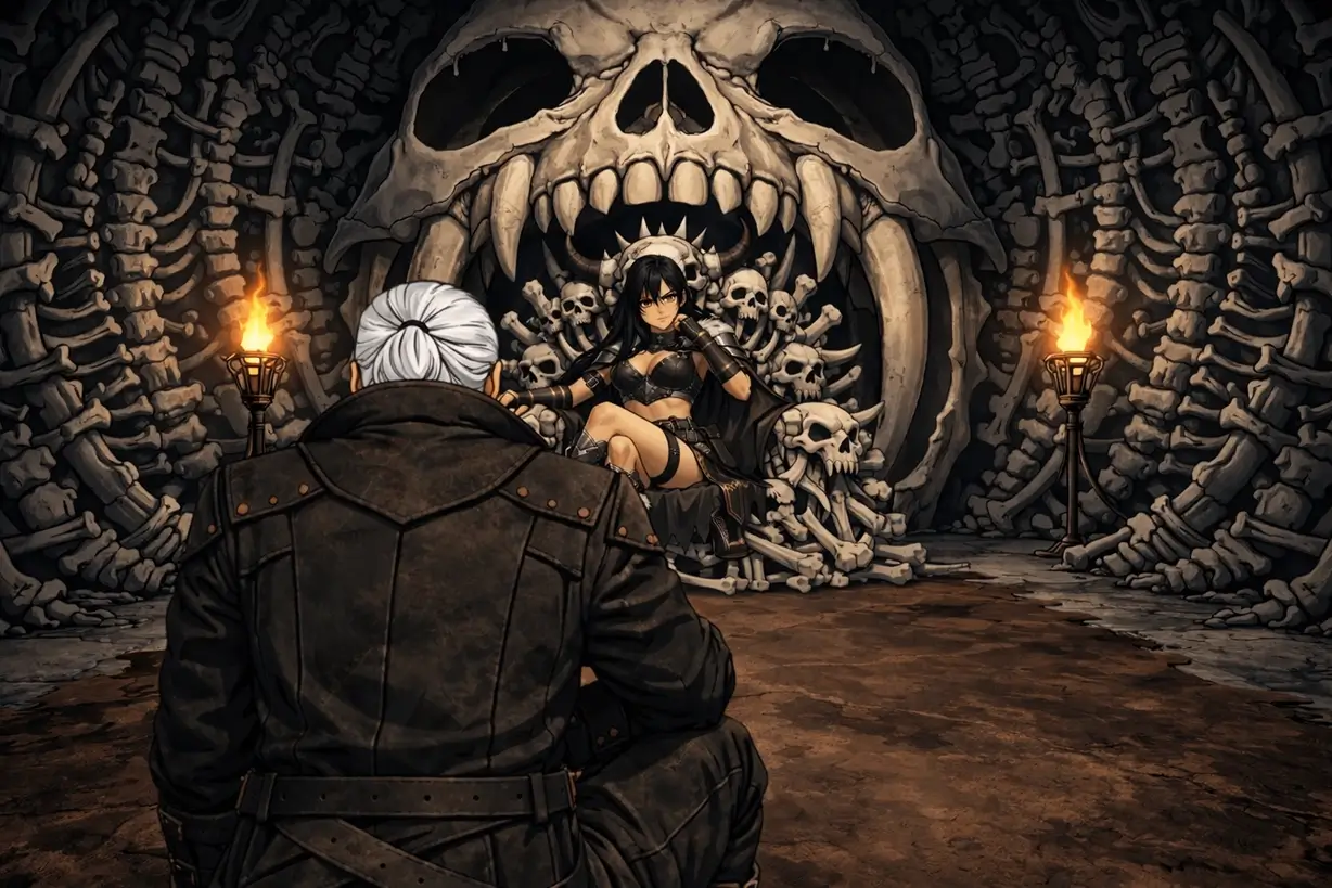 Ele atravessa um corredor largo e chega a um portão. Entra. O chão cede ao tapete de couro sob seus pés. À frente, um trono feito de incontáveis ossos, empilhados com a paciência cruel de quem nunca esquece uma vitória.