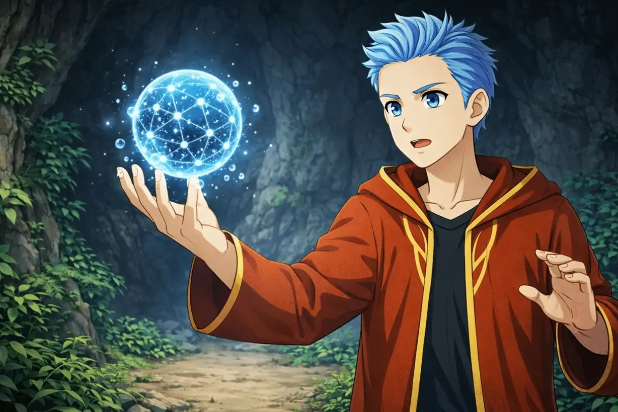 Uma esfera se forma em sua palma. Pontinhos de luz surgem na superfície e, um a um, são ligados por um traço fino, formando uma rede: um mapa compacto de intenção e cálculo.