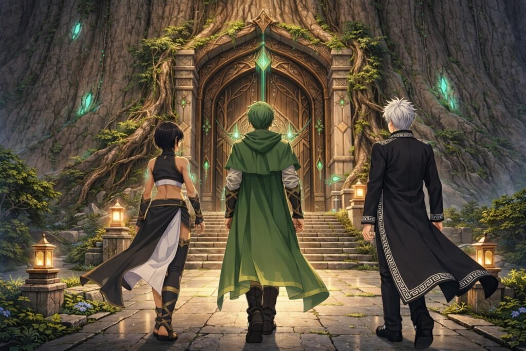 Eles voltam a caminhar e chegam aos portões na base da árvore colossal. Grandes e robustos, Sundar toca a madeira, que reage à insígnia em seu peito. O portão se abre sem ranger, apenas com o estralar vivo da madeira cedendo.
