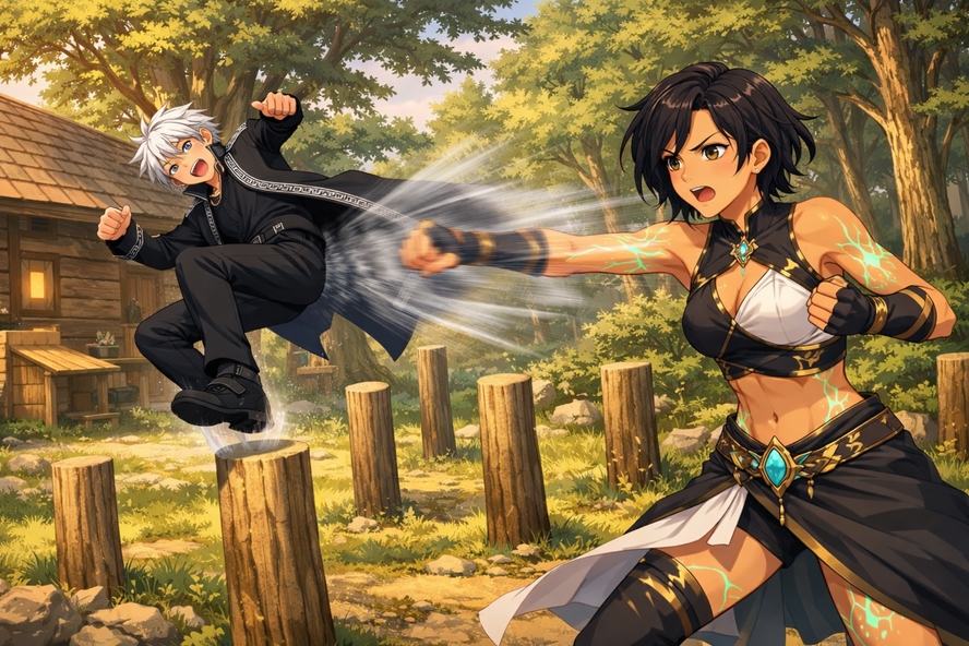 Então eles focam nos outros treinos. Com a base sólida, ele logo domina a respiração: o ar entra, o Eco responde, e a mente para de tropeçar nos próprios pensamentos. A percepção melhora. Heragon começa a desviar com mais frequência dos golpes de Elena, lendo ombros, quadris, intenção.