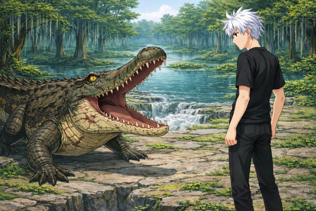 À sua frente, uma criatura monstruosa. Couraça grossa, focinho alongado, dentes afiados… e aquela calma predatória que anuncia tempestade.